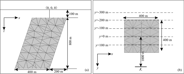 图 8 倾斜板状低阻异常体 (a) x-z平面断面; (b) x-y平面断面. Fig. 8 Model of an inclined plate-like low-resistivity body (a) x-z cross section; (b) x-y cross section. |