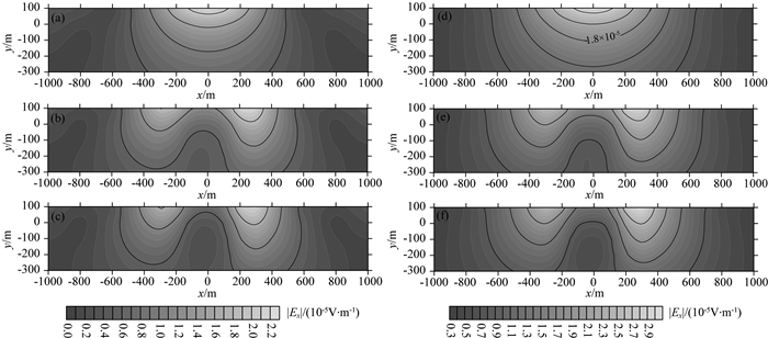 图 9 倾斜板状异常体模型的电场总场Ex分量振幅 1)激发频率为1 Hz: (a)均匀半空间; (b) 0.1 S·m-1的倾斜板状异常体; (c) 0.333 S·m-1的倾斜板状异常体. 2)激发频率为32 Hz: (d)均匀半空间; (e) 0.1 S·m-1的倾斜板状异常体; (f) 0.333 S·m-1的倾斜板状异常体. Fig. 9 X-component amplitude of the total electric field Ex for a model of an inclined plate-like anomaly body 1) Excitation frequency 1 Hz: (a) Homogeneous half-space; (b) Inclined plate-like anomaly body of 0.1 S·m-1; (c) Inclined plate-like anomaly body of 0.333 S·m-1. 2) Excitation frequency 32 Hz: (d) Homogeneous half-space; (e) Inclined plate-like anomaly body of 0.1 S·m-1; (f) Inclined plate-like anomaly body of 0.333 S·m-1. |