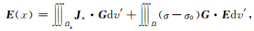 其中,Ω为异常体区域,Ωs为场源区域的积分.(6)式既是观测点数据求取的方程亦是进行求解异常电场的方程.本文采用的并矢Green函数为均匀半空间下的频率域张量格林函数,其具体形式由Hohmann(1975)给出(见附录).从公式(6)可以看出,任意点的总场是由源Js激发的背景场和异常电导率(σ-σ0)产生的散射场组成,图 1a展示了3D CSEM工作原理.