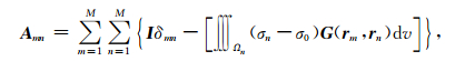 其中,E=[E1, E2, …, E3M]T和Eb=[E1b, E2b, …, E3Mb]T分别为由离散单元中心未知场以及背景场组成的3M列向量,T表示矩阵转置,矩阵A为离散单元的系数,表达式为: