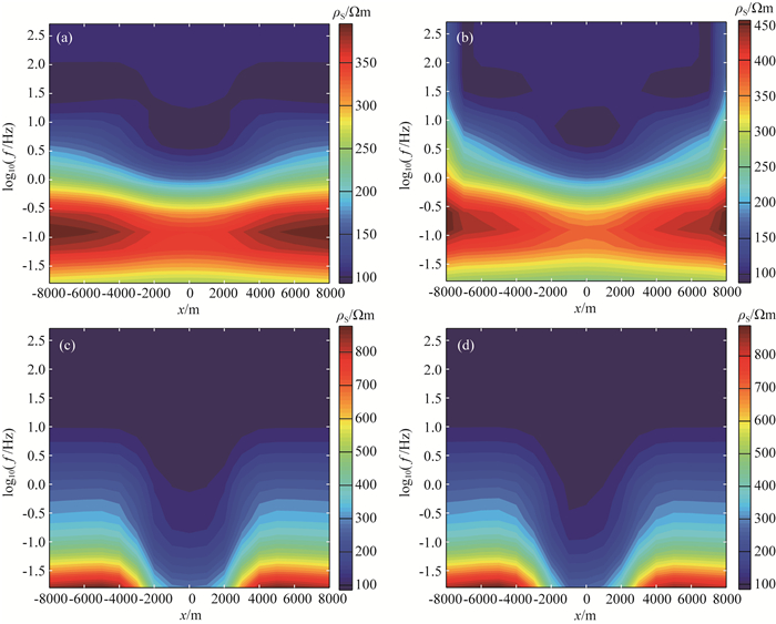 图 8 地堑模型理论视电阻率与GA-BP反演拟合视电阻率对比 (a) TE模式理论视电阻率; (b) TE模式拟合视电阻率; (c) TM模式理论视电阻率; (d) TM模式拟合视电阻率. Fig. 8 Comparison between theoretical apparent resistivity and apparent resistivity from GA-BP inversion on graben model (a) Theoretical apparent resistivity of TE mode; (b) Calculated apparent resistivity of TE mode; (c) Theoretical apparent resistivity of TM mode; (d) Calculated apparent resistivity of TM mode. |