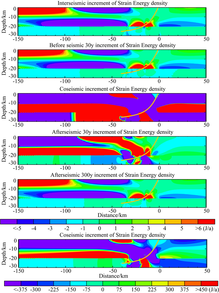 (3) 同震应变能变化模式显示:断层周围和上地壳近地表大部分区域的应变能变化均为负值,说明地震会大量释放断层上和上地壳近地表的应变能.且同震应变能释放区的变化量可达相同地点震间期应变能积累变化量的几百倍量级,说明一次地震可以释放几百年量级的应变能积累.同时,地震的发生会使地壳内几个区域应变能加载,分别为:上盘近地表距离断层出露点约30~50 km区间范围内,断层延伸轨迹远端的上地壳底部;以及,上盘中地壳内靠近断层端约50 km区间范围内,下盘中,-20 km深处、断层几何曲率最大处以下的小范围内.中地壳中黏弹性介质由于地震发生,应变能增加量是震间期应力增加量的几十倍,主要通过震后过程释放.