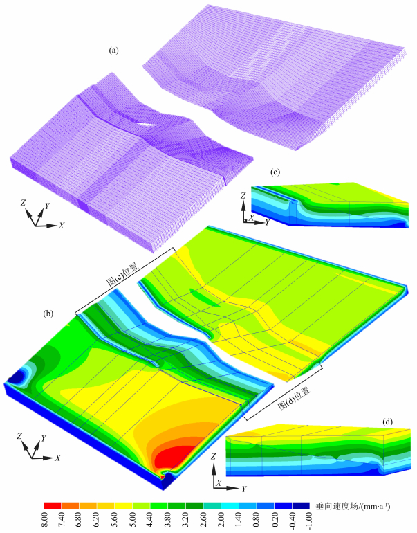 图 3 有限元网格分布(a)及初始垂向速度场(b),最左侧(c)和最右侧(d)边界断层两盘的初始变形 Fig. 3 Finite element mesh (a), initial vertical velocity field on the whole model (b), initial vertical deformation of the hanging wall and footwall on the left boundary (c) and on the right boundary (d) |