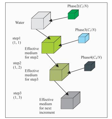 不失一般性,以四相微增模型为例,图 1为四相微增模型介质形成过程中的第一次微增过程,首先假定其中三种矿物的初始浓度分别为C2、C3、C4,将它们分成N块,即每小块的浓度分别为C2/N、C3/N、C4/N.接着,以水作为初始背景介质,将每种成分介质(C2/N,C3/N,C4/N)根据一定的顺序依次添加,形成一次等效介质,这就完成了一次微增过程,然后将该次形成的等效介质作为下一次微增过程的初始介质,继续依次添加各种介质成分,直到循环添加完所有介质成分,即完成N次.而在每添加一种介质成分时,就运用一次Asami方程来计算介质的等效电导率,最后共进行3N次Asami方程计算.其中关键参数是各种物质成分的初始浓度值(C2,C3,C4),因为只有知道了每种微增的物质成分的初始浓度时,才能计算每次微增过程中的‘背景’介质的含量,从而利用公式(1)计算出相应的等效电导率值.例如,在计算出C2情况下,在每次微增phase2物质时,方程(1)右端项ϕ=1-C2/N(为‘背景’介质的含量),接着将有关参数代入方程(1)即可计算出在添加phase2物质后的等效电导率.类似的,微增phase3物质和phase4物质亦如此,不同的是,方程(1)的右端项分别变为1-C3/N和1-C4/N.为了计算各种介质的初始浓度值(C2,C3,C4),首先给定相应的体积百分数(V2, V3, V4)以及微增总数N, 通过附录所给出的方程(A1—A11),来进行逆推计算求得各种介质的初始浓度值,具体可参照附录部分.以此类推,最终形成多相微增模型.本文为了简便起见,只研究海洋电磁法勘探中水,黄铁矿、石英、以及油气这四相介质组合形成的海洋沉积岩的成分、结构对电导率特性以及海洋可控源电磁场的影响特征.