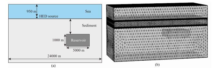 为了分析不同岩石结构参数对海洋可控源电磁场影响规律,设计一个含有黄铁矿、水、油气、石英四相介质的油藏模型,分别改变油气藏的岩石结构参数进行正演计算.油藏的规模大小为5 km×5 km×1 km,中心位于(2000,0,2500).表 3列出了海洋油藏模型的Incremental模型参数, 几何示意图如图 8a所示.采用COMSOL软件直接生成的非结构化网格剖分如图 8b所示,在激发源和测线附近同样进行了局部加密处理.激发源为x方向的水平电偶极子,位置在(-2000,0,980)处,发射电流为1 A,因篇幅有限,设定发射频率为0.1 Hz.接收点电极位于z=1000 m处.分析y=0,z=1000处的电磁场二次场各分量响应特征.