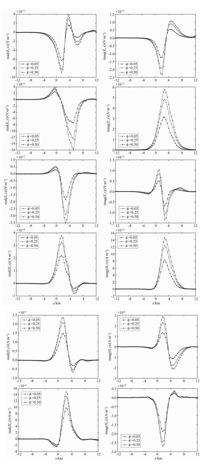 图 9为取不同孔隙度下的电磁场二次场虚、实分量曲线,从图 9上可知,随着孔隙度越大,含水饱和度一定的情况下,电磁场二次场各虚、实分量异常变化幅度明显减小.