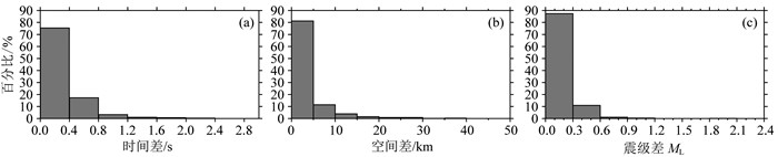 对于较小尺度的空间区域(如某个地震序列),地震事件的空间和强度极易重复,但由于时间的单向性,在同一时刻发生(或在波形中能分辨出)两个或多个地震的可能性极低,因此每个地震事件都有着几乎独一无二的发震时刻.在定位准确的前提下,不同台网记录到“事实上”的同一地震的发震时刻应该相差无几,此时即可获得它们时间差的极小值;反之可认为不同台网之间记录到的那些具有最小发震时间差异的地震,很有可能是同一地震;在此基础上,再比较它们在空间和震级上的差异,并对结果进行统计分析.