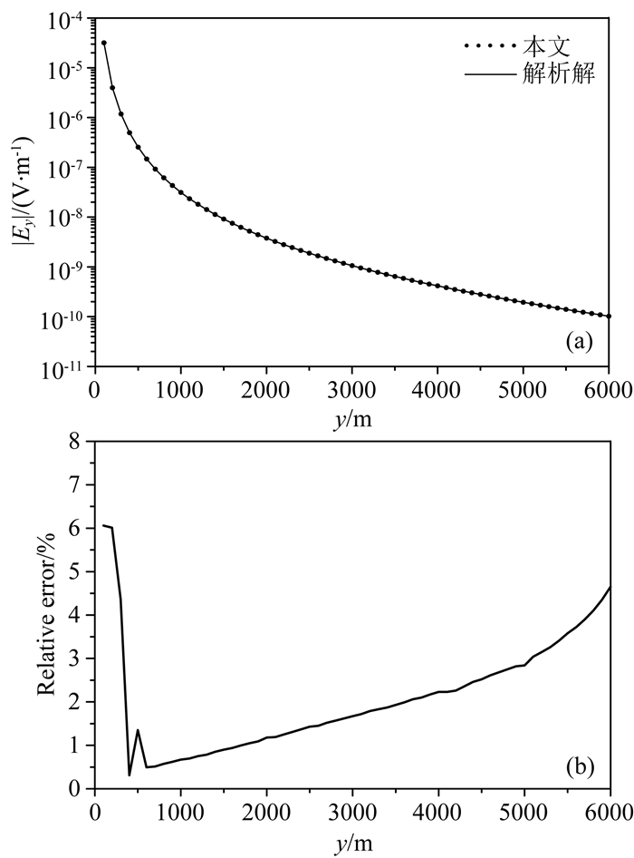 图 4 均匀半空间模型正演结果与解析解对比 (a)电场水平分量振幅模拟结果对比;(b)电场水平分量振幅相对误差曲线. Fig. 4 Comparison of forward modeling of half space model with the analytical results (a) Comparison of Ey-field amplitude; (b) Relative errors for Ey-field amplitude. |