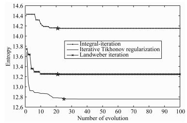 图 2为三种迭代法采用微分进化法选取最优参数时,进化代数与目标函数的关系曲线,由图 2可知,随着种群不断进化,三种迭代方法的目标函数值均逐渐减小,最后趋于稳定.其中,积分迭代法进化23代后熵值稳定在14.07,最优参数分别为s=2,n=1.4734(取整后n=1);迭代Tikhonov正则法进化25代后熵值稳定在12.67,最优参数分别为α=0.0075,n=1.9112(取整后n=2);Landweber迭代法进化21代后熵值稳定在13.13,最优参数分别为α=1.8898,n=29.5987(取整后n=30).这说明微分进化法搜索结果是收敛的,且进化二十几代即使延拓结果熵值达到最小,收敛速度较快.