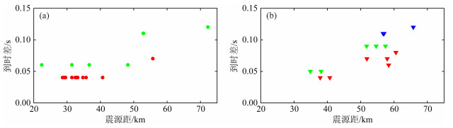 图 8 VIB台快慢波到时差随震源距变化 (a)时窗Ⅰ中快慢波到时差(圆点);(b)时窗Ⅱ中快慢波到时差(三角形).红色、绿色和蓝色分别对应于图 6中的f-a路径、f-b路径和f-c路径的快慢波到时差. Fig. 8 Unnormalized time-delay variation with hypocentral distance (a) Time-delays (dot) between in time window Ⅰ; (b) Time-delays (triangle) in time window Ⅱ. Red, green, and blue correspond to the time-delays between path f and a, path f and b path, and path f and c path in Fig. 6, respectively. |