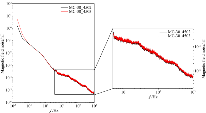 针对MC-30的本底噪声测试,选择两枚幅频和相频特性相一致的MC-30探头(编号为:4502,4503),在同一地点,同步测试,得到两个探头实测的噪声数据,见图 8.