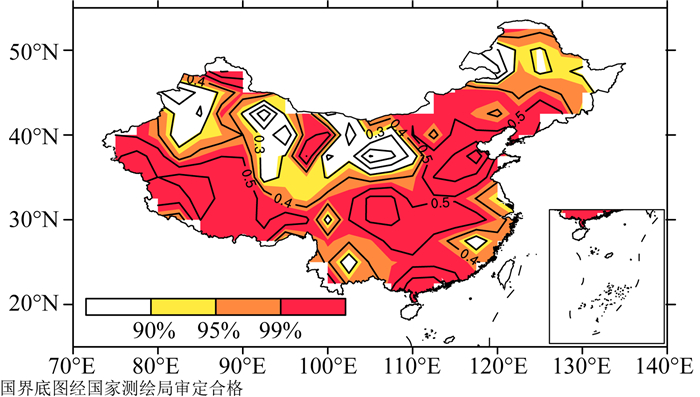 图 10 1982—2015年CFSv2统计降尺度订正与统计预测的融合结果同夏季降水观测之间时间相关系数的空间分布,阴影表示90%~99%显著性水平 Fig. 10 The correlation coefficients of observed summer precipitation with the merging predictions of statistical model and CFSv2 statistical downscaling during 1982— 2015.The shaded areas correspond to 90%~99% confidence levels |
