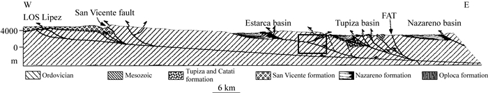 图 1 Y型分叉断层实例(引自Hérail et al., 1996) 这是玻利维亚南部Nazareno盆地至San Vicente断层之间的剖面图,图中方框所示的断层具有Y型的分叉结构. Fig. 1 A true example of Y-shaped branched faults (Hérail et al., 1996) This is a cross section from the Nazareno basin to the San Vicente fault in southern Bolivia. A Y-shaped branched fault is shown in the rectangle. |