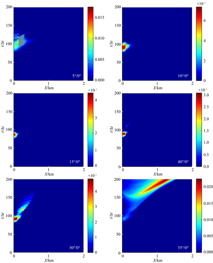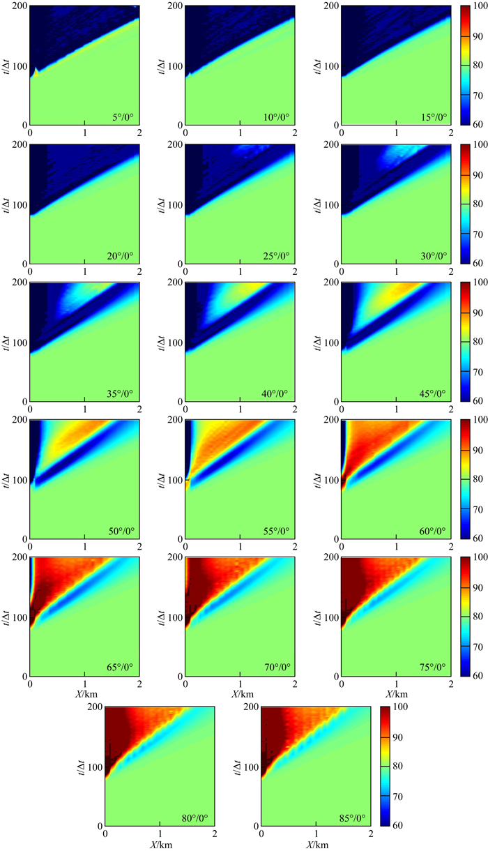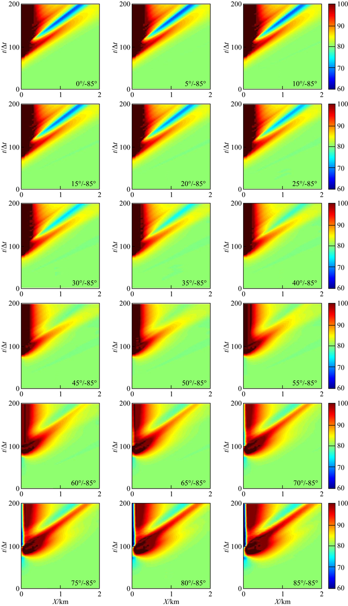 当ϕ2增大到40°,在X=0 km、t≈80Δt处,应力值开始持续减少,直到ϕ2=85°时,已经可以在这个位置看到比较深的蓝色.当ϕ2≥55°时,破裂基本不再从三联点开始,而且随ϕ2增加不断右移,与此有一定关系.
