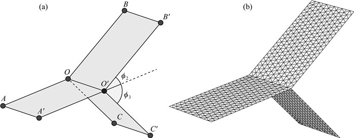 图 2 分叉断层示例及其离散化 (a)分叉断层示例:OO′A′A为第一表面;OO′B′B为第二表面;OO′C′C为第三表面;OO′为三联点;ϕ2为第二表面与第一表面延长面的夹角;ϕ3为第三表面与第一表面延长面的夹角.(b)分叉断层离散化示例. Fig. 2 An example of branched faults and corresponding discretized ones (a) An example of branched faults. The first surface: OO′A′A; the second surface: OO′B′B; the third surface: OO′C′C; triple junction: OO′; the angle between the second surface and the extension of the first surface: ϕ2; the angle between the third surface and the extension of the first surface: ϕ3. (b) Discretized branched faults in (a). |