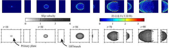 图 3 分叉断层上的滑动速率快照与Aochi等(2000)结果的比较 下图:Aochi等(2000)计算得到的分叉断层上的滑动速率快照,标出了无量纲时刻,左侧和右侧的矩形分别为第一表面和第二表面;上图:本文对同一模型的数值模拟结果. Fig. 3 Slip rate snapshots on a branched fault compared with Aochi et al. (2000) The lower figure shows the slip rate snapshots on a branched fault computed by Aochi et al. (2000), with the dimensionless time marked, the rectangles on the left representing primary plane and the ones on the right representing off branch. The upper figure shows the numerical simulation result of the same model with our method. |