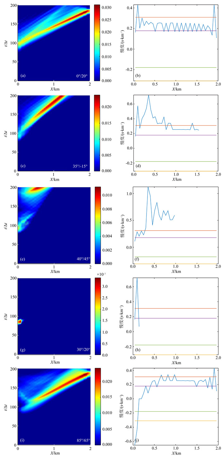 以图 4g和4h的30°/20°为例,破裂自然终止.在破裂前锋的慢度图像中,这类情况的破裂前锋慢度折线极短,可能只有几个数据点.