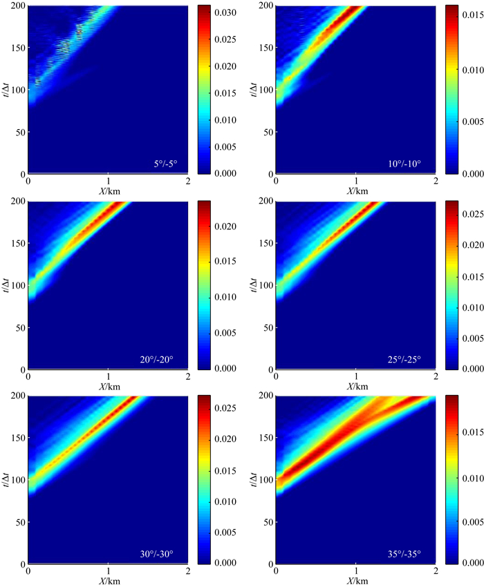 从断层中间线上滑动速率的图像,如图 7,可以得到更多的信息.在ϕ2较小时,随着ϕ2的增加,发生破裂的区域收缩,滑动速率整体减小,如图 7a—c.但是当ϕ2=40°,第一次破裂终止后又发生了新的滑动,两次滑动在时间和空间上不连续,这是此前的图像中不曾见到的,如图 7d;当ϕ2继续增大,到55°为止,两次滑动彼此连在一起,能够进入超剪切状态而不终止,滑动速率的最大值也有提高,如图 7e—f.随着ϕ2的增加,破裂行为原本的变化趋势发生了改变.