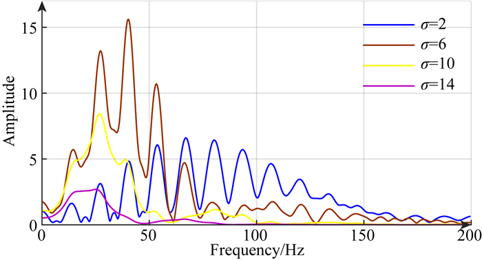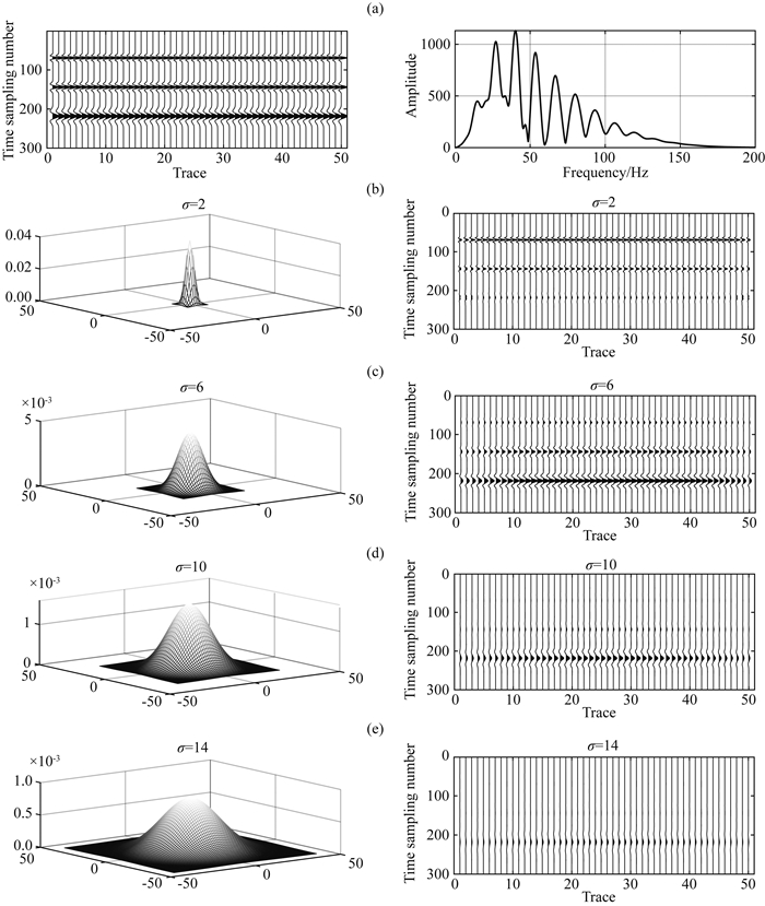 为了进一步说明多尺度理论在基于Hessian矩阵去噪中的必要性,设计了如图 1所示的数值模型.图 1a为设计的数值模型及其频谱,包含了三条水平同相轴,从上至下主频分别为70、50和30 Hz.1b—1e是尺度因子分别等于2、6、10、14时的高斯滤波器及线性响应输出结果,图 2是各个尺度下线性响应输出结果对应的频谱.可以看出,当尺度因子较小时,线性滤波器响应输出的主频较高;尺度因子增大时,线性滤波器响应输出的主频随之降低.由此我们可以得出如下结论:基于Hessian矩阵的多尺度滤波器在小尺度时输出高频信号,大尺度时输出低频信号,因此,我们对地震资料进行去噪处理时,要想兼顾有效信号高频和低频的能量就必须在多个尺度上进行处理,获得不同的尺度空间中的滤波器响应,最终综合得到去噪结果.