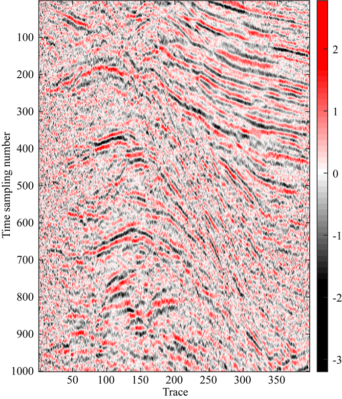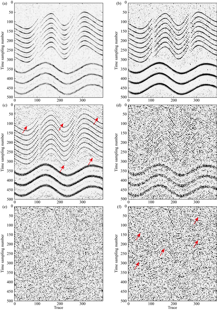 为了验证本方法的去噪性能,设计了如下数值模型,其中图 3a为原始未加噪声数据,共390道,500个采样点,采样间隔1 ms.图 3b为加入带限高斯随机噪声数据(噪声频宽与有效信号频宽一致),信噪比为-0.0093 dB.分别采用了本文提出算法和传统算法F-X反褶积进行了去噪处理,结果如图 4所示.