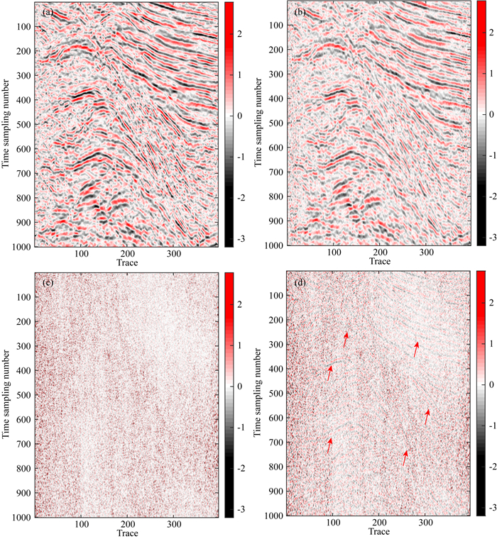 图 6 叠后地震资料去噪结果对比. (a)本文算法去噪结果;(b) F-X反褶积去噪结果;(c)本文算法去噪后的噪声;(d) F-X反褶积去噪后的噪声 Fig. 6 Comparison of denoising results of post stack seismic data. (a) Denoising results of the proposed algorithm; (b) denoising results of F-X deconvolution; (c) Noisy section using the proposed method; (d) Noisy section using F-X deconvolution |
