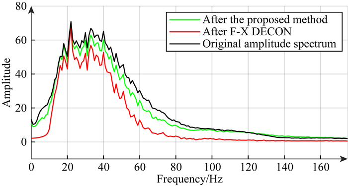 图 6a和b分别是基于Hessian矩阵的多尺度去噪和F-X反褶积去噪结果,图 6c和d是两种去噪算法得到的噪声剖面.从实际去噪效果来看,F-X反褶积算法虽然具有一定的去噪效果,但是对有效信号有不同程度的损伤,从噪声剖面中可以明显看到有效信号的存在(如6d中红色箭头所示).而本文方法去噪结果信噪比更高,而且有效信息也更丰富,同相轴相对更加连续,噪声剖面中基本没有有效同相轴的痕迹,说明该方法对有效信号的损伤较小.图 7为两种方法去噪后的频谱对比,可以看到,本文所提算法去噪结果的频谱与F-X反褶积去噪结果的频谱相比频带更宽,对高低频信号能量保护性更好,并且与原始信号的频带也更为接近.