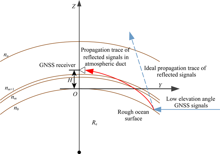 1 模型及方法 1.1 模型为了使GNSS卫星海面反射信号在传播过程中受蒸发波导的折射效应更加显著,本文以岸基或舰载GNSS反射信号接收机接收低高度角GNSS海面反射信号为背景,建立了如图 1所示的GNSS海面反射信号接收模型.由于蒸发波导的高度通常不超过30 m,因此,模型中的GNSS反射信号接收机天线的高度小于30 m.为了便于接收低高度角GNSS海面反射信号,GNSS反射信号接收机天线的波束中心平行地面,并指向GNSS卫星所在的方向.图 1模型中的直角坐标系以GNSS反射信号接收机在海面的投影O为原点;O与地心连线为Z轴,竖直向上为正方向;Y轴与地球表面相切于原点O,并指向GNSS卫星的方向;X轴由Y轴和Z轴按右手法则定义得到.图 1中红色带箭头实线示意了GNSS反射信号在蒸发波导折射效应作用下的一条传播的轨迹,图中虚线表示其在无大气折射效应时的传播轨迹.图中n0、n1、…、nn表示依据球面大气分层方法划分的不同大气层的折射率,其中n0表示地面大气折射率.