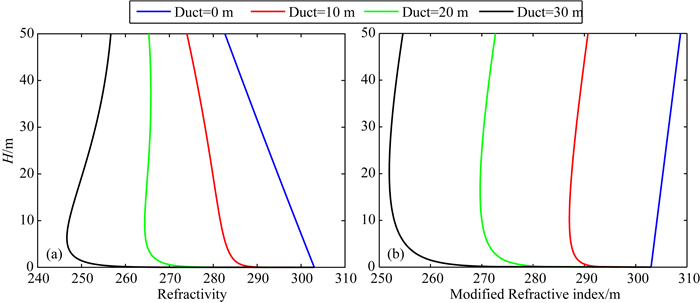图 2 不同蒸发波导高度条件下的大气剖面 (a)折射率剖面;(b)折射指数剖面. Fig. 2 Atmosphere with different evaporation duct height (a) Refractivityprofile; (b) Modified refractive indexprofile. |