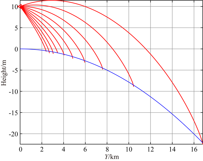 图 3 迭代仿真过程中的射线轨迹(蒸发波导高度为30 m,接收机高度为10 m) Fig. 3 Ray tracing results during iterative simulation with evaporation duct height of 30 m and receiver height of 10 m |