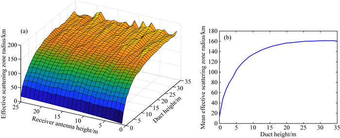 图 4 仿真得到的有效散射区域半径 (a)不同接收高度和波导高度;(b)不同接收机高度的平均. Fig. 4 The simulated effective scattering zone radius (a) Withdifferent receiver antenna heights and duct heights; (b) Averaged with different receiver antenna heights. |