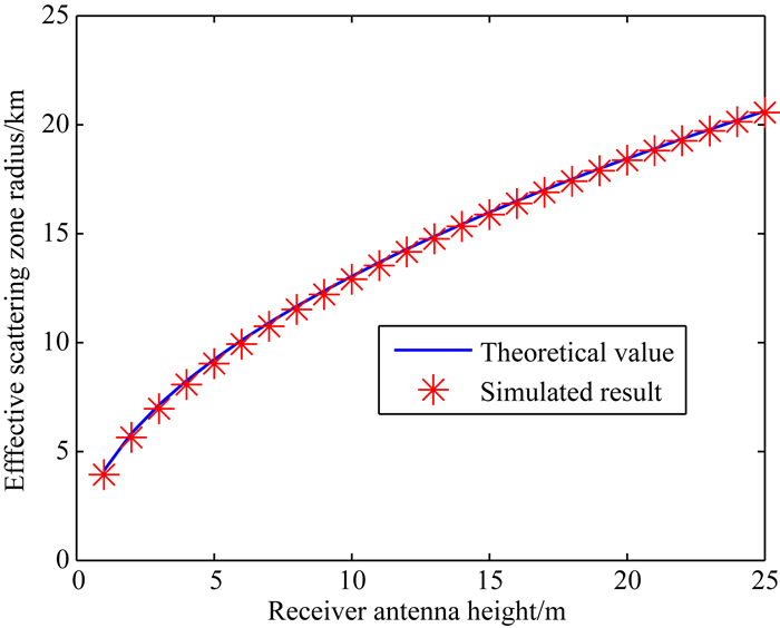 由图 5可知,GREEPS仿真软件得到的仿真结果与解析计算结果吻合的非常好,这证明了仿真方法的有效性.由图 4a可知,GNSS反射信号海面反射信号的有效散射区域半径即受蒸发波导高度的影响也受GNSS反射信号接收天线高度的影响,但是,与蒸发波导高度的影响相比,接收机天线高度的影响几乎可以忽略,这意味蒸发波导的存在与否,可以很容易地利用GNSS反射信号有效散射区域的大小进行判断.由图 4b可知,蒸发波导对GNSS反射信号的有效散射区域半径的影响十分显著,当蒸发波导高度由0 m增加到20 m时,有效散射区域半径大小由14 km增加到了约160 km;然而,当蒸发波导高度继续增加时,有效散射区域半径变化不大,趋于稳定.