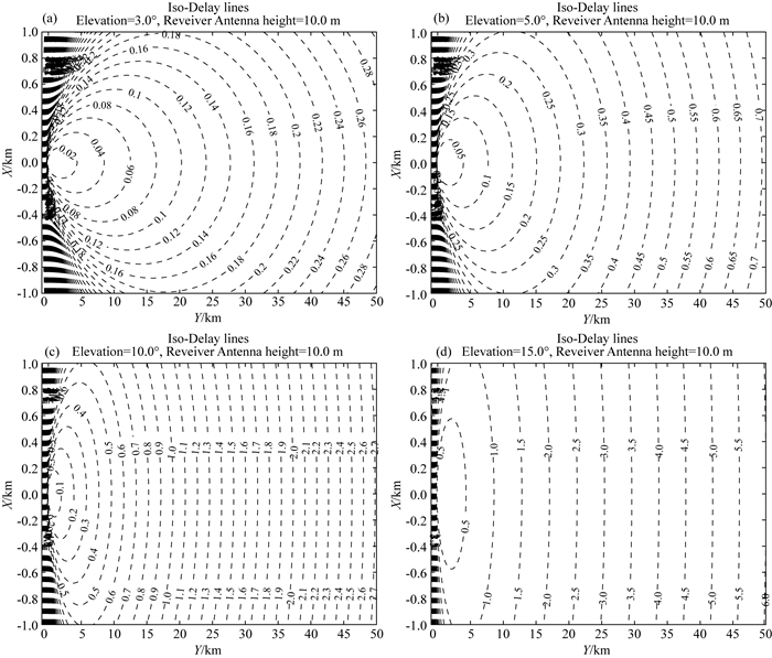 图 6 GNSS反射信号等时延线 接收机高度为10 m,GNSS卫星高度角分别为(a) 3°; (b) 5°; (c) 10°; (d) 15°. Fig. 6 GNSS reflected signals'iso-delay lines The receiver height is 10m and the GNSS satellite elevation angles are (a) 3°; (b) 5°; (c) 10°; (d) 15°. |