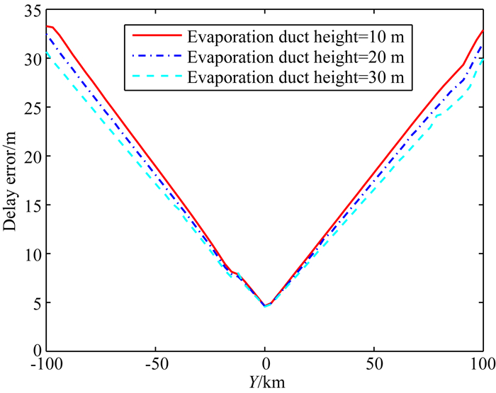 2.2.2 蒸发波导对GNSS反射信号相对传播时延的影响当接收机高度仍固定为10 m,将GNSS卫星的高度角固定为15°时,利用GREEPS仿真软件计算了波导高度分别为10 m、20 m和30 m的蒸发波导对Y轴上-50~50 km范围内的海面散射点的相对传播时延的影响,结果如图 7所示.图中大于0 km的海面反射点位于GNSS卫星一侧,即图 1中Y轴的正半轴上.