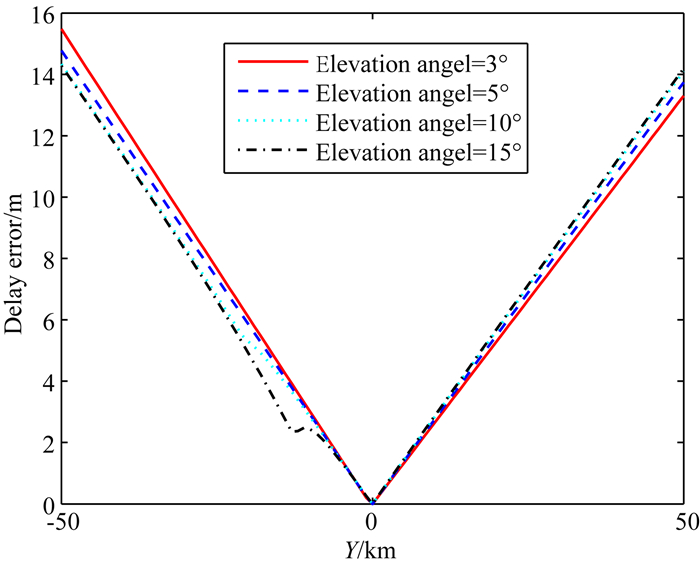 当接收机高度仍设定为10 m,而波导高度设定为15 m时,利用GREEPS软件仿真得到了GNSS卫星高度角分别为3°、5°、10°和15°时,蒸发波导对Y轴上-50~50 km范围内的海面散射点的相对传播时延的影响,如图 8所示,图中距离大于0的海面反射点位于GNSS卫星一侧,即图 1中Y轴的正半轴上.