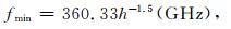式中, P、e、T分别表示大气压强(hPa), 水汽分压(hPa)和大气温度(K), z表示距离地面的垂直高度(m).当大气修正指数M的垂直梯度满足dM/dz < 0 m-1(相应的折射指数梯度dN/dz小于-0.157 m-1)时, 表示存在大气波导, dM/dz=0的点所对应的高度称为波导高度.文献(Freehafer, 1988)给出了利用蒸发波导高度计算最低陷获电磁波频率的经验公式,即: