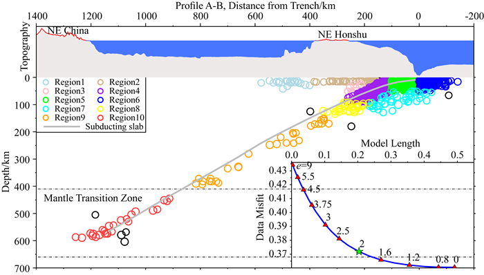 图 3 深度剖面分区示意及反演阻尼系数挑选 将研究区域内所有GCMT事件及俯冲带等深线投影到AB剖面上得到本深度剖面图中的地震事件分布及俯冲板片轮廓线,并分别以圆圈与灰色实线表示;地形曲线做了垂向压缩,以便展示大陆、弧后、岛弧、海沟、大洋板片所在位置.在剖面图中按照地震分布的位置、深度、空间密集度等标准将域内所有地震事件划分在10个分区内,并以不同颜色的圆圈表示,未划入应力分区内的事件以黑色圆圈表示.右下角内插图为挑选反演所用阻尼系数的trade-off曲线,反映着剪切应力方向同断层滑移方向间的拟合误差大小(data misfit)与相邻应力分区内应力模型间差值大小(model length)之间的相对变化关系,最终进行反演时选取曲线拐角处的量值2.0. Fig. 3 Illustration of 10 divisions along the depth profile and selecting the damping parameter Projecting the events′ focus and depth contours of subducting slab onto the profile AB results in this picture including events′ focus and the subducting slab outline in form of circles and gray solid line. Ten schemes are generated according to events′ location, depth and spatial cluster of focus, and each corresponds to the specific color circle. Events which′re outside all ten schemes are plotted as black circles. The topography in the upper panel shows the relative location of continent, back-arc, island arc, trench and oceanic slab. The lower right inset shows the trade-off curve between model length and data misfit in the inversion process while choosing various damping parameters, and the damping parameter is selected as 2.0 here finally. |
