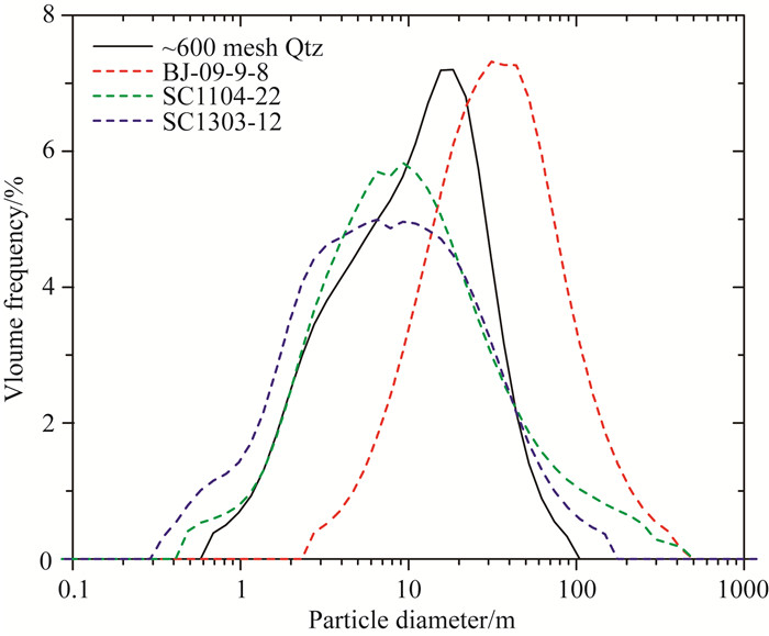 图 1 样品中石英粉末的粒度分布(实线).几种典型的龙门山断裂带断层泥样品的粒度分布结果绘在图中用作对比(虚线;陈进宇等,2017) Fig. 1 Particle size distribution (PSD) of the quartz powder used in this study (solid line), as compared to PSD of representative natural gouge samples from the Longmenshan fault zone (dashed lines; Compiled after Chen et al., 2017) |