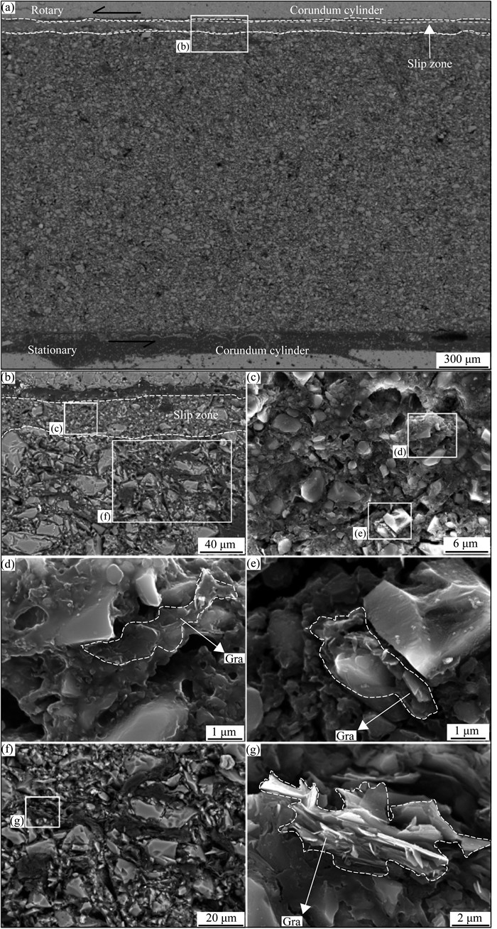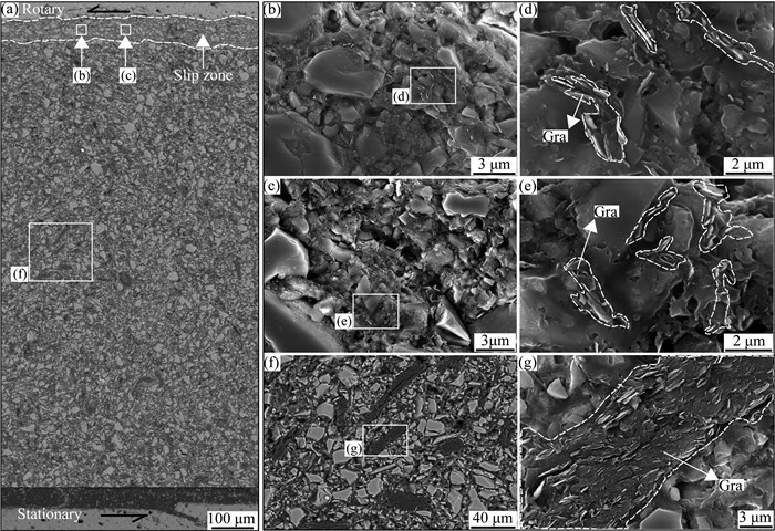 图 11 7wt%石墨含量的石英-石墨混合断层泥样品在500 μm·s-1滑动速率下滑动1.5 m距离条件下的变形显微结构 (a)变形模拟样品的整体图像;(b)-(g)局部放大图像.图中矿物缩写为Gra:石墨. Fig. 11 The microstructures of the quartz-graphite gouge (7 wt% graphite) deformed at a slip rate of 500 μm·s-1 and a displacement of 1.51 meter (a) Microstructures of the entire gouge layer; (b)-(g) Close-up view of the gouge. Abbreviation of minerals: Gra: graphite. |