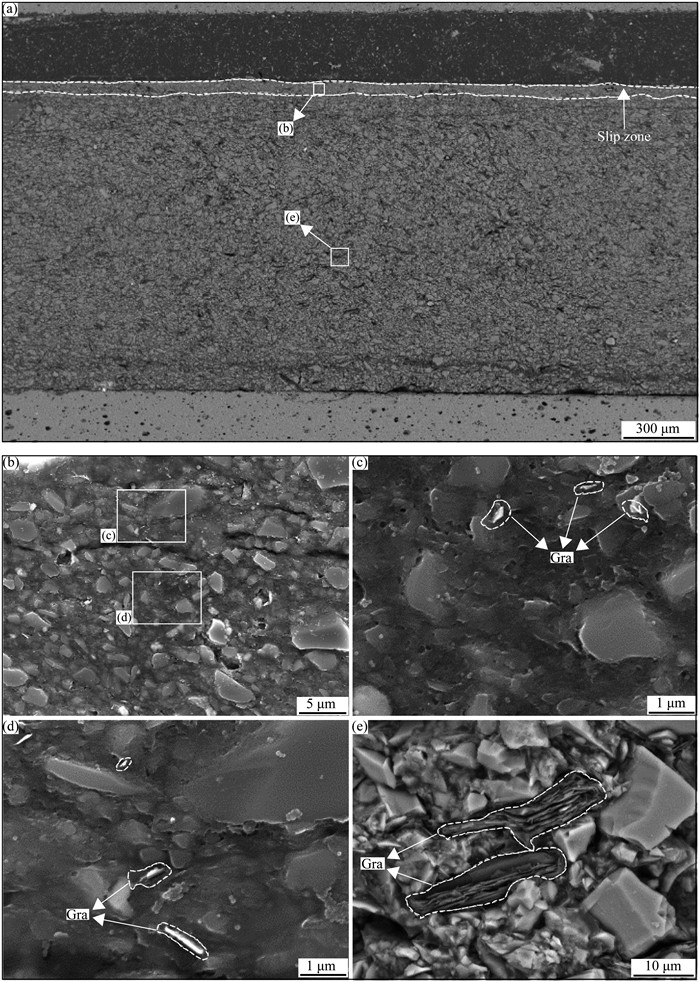 经历长距离的高速滑动后(V=1 m·s-1,D=33 m),滑动带内的石墨含量大幅减少几近消失,仅剩下零星小颗粒(粒径<0.5 μm)(图 12a-12d).远离滑动带样品依然保持与初始样品相似的结构特征(图 12e).