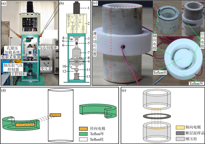 图 2 (a) 中国地震局地质研究所Shimamoto第三代旋转剪切低速-高速摩擦实验机(LHVR-Beijing; Ma et al., 2014);(b)实验系统主要部件的示意图,1 伺服马达,2 齿轮/皮带变速系统,3 主加载框架,4 旋转记录器,5 样品,6 围岩锁固装置,7 轴压杆稳固平台,8 轴压杆,9 扭矩计,10 轴向位移计,11 推力轴承,12 轴向载荷计,13 轴压气缸;(c)装样结构实物图;(d)和(e)分别为径向和轴向方向的电极装配图 Fig. 2 (a) A photograph of the rotary-shear low to high velocity frictional testing machine (LHVR-Beijing; 3rd generation machine designed by Prof. Shimamoto) at Institute of Geology, China Earthquake Administration. (b) A schematic diagram of the main units of the LHVR-Beijing. 1 servo-motor, 2 gear/belt system for speed change, 3 loading frame, 4 rotary encoder, 5 specimen assembly, 6 locking devices of specimens, 7 frame for holding the lower loading column, 8 axial loading column, 9 torque gauge, 10 axial displacement transducer, 11 thrust bearing, 12 axial force gauge, 13 air actuator. (c) A photograph of the sample assembly. (d) and (e) Schematic diagrams showing the electrode assemblies for electrical conductivity measurement along directions parallel and perpendicular to slip surface, respectively |