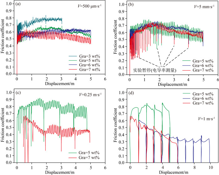 图 3 不同石墨含量样品在不同滑动速率(V)下的摩擦-位移曲线 (a) V=500 μm·s-1; (b) V=5 mm·s-1; (c) V=0.25 m·s-1; (d) V=1 m·s-1.曲线中摩擦系数的大幅瞬时降低(竖垂线“|”)是由于摩擦实验突然暂停(开展电导率测量)造成的. Fig. 3 Friction coefficient versus displacement curves for samples with different graphite contents in friction experiments at various slip rates Each large drop in frictional coefficient in the curves (vertical lines in each curve) is caused by a pause in the experiment, during which electrical conductivity measurement was performed. |