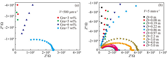 在500 μm·s-1~1 m·s-1速率下,含碳量为3,5,6,7 wt%的样品其径向阻抗谱图均只出现一个阻抗弧(图 4).在相同的剪切速率和滑动距离条件下,样品径向阻抗谱圆弧的直径随石墨含量的增加而逐渐变小,表明其电阻值也相应地降低(图 4a).例如,在相同的实验条件下,相比于石墨含量为3 wt%的样品,石墨含量为7 wt%样品的电阻值有约4个数量级的降低.对于石墨含量为7 wt%的样品,在相同的剪切速率下,其径向阻抗谱弧半径与相应的电阻值随着滑动距离的增加也不断地减小(图 4b).值得说明的是,在滑动距离由0.19 m增加至0.22 m的过程中,样品的电阻值下降了约3个数量级,显示较短距离(D < 0.22 m)的剪切滑动便可以显著地提升样品沿滑动方向的导电性能.与之相反的是,在500 μm·s-1~1 m·s-1速率下,含碳量为3,5,6,7 wt%的样品其轴向阻抗谱图表现出与石墨含量、滑动速率和滑动位移无明显相关的特点.