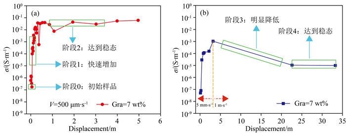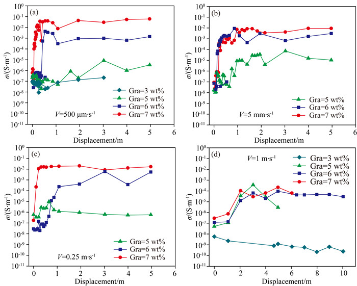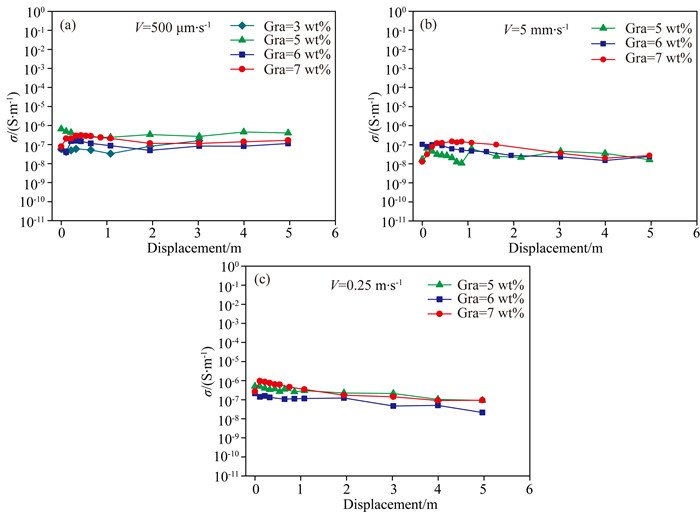 样品轴向电导率受摩擦滑动的影响较小.随着滑动距离的增加,样品轴向电导率的变化始终处于一个数量级的范围之内,并且电导率的变化与样品中的石墨含量和滑动速率没有明显相关关系(图 7).