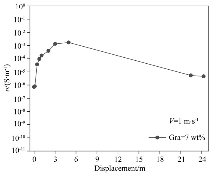 样品径向电导率随着摩擦滑动总体呈现出明显的变化(图 5).在500 μm·s-1,5 mm·s-1和0.25 m·s-1的滑动速率下(图 5a-5c),石墨含量为6和7 wt%样品的径向电导率在很短的滑动距离内(多在数十厘米范围)迅速升高,之后维持在稳定的数值(如石墨含量为7 wt%样品的电导率由初始的10-8~10-7 S·m-1迅速增加至0.01~0.1 S·m-1);石墨含量为5 wt%样品的径向电导率随着摩擦滑动仅呈现出缓慢的增加,且不同速率下增加的幅度存在差异;对于石墨含量为3 wt%的样品,尽管数据有限,但依然可见摩擦滑动对样品径向电导率几乎无明显的提升(图 5a).总体而言,500 μm·s-1~0.25 m·s-1滑动速率下,摩擦滑动对样品电导率的提升效应随着石墨含量的增加而显著增强.不过,在1 m·s-1的高速小位移滑动过程中,石墨含量为5 wt%,6 wt%和7 wt%的样品的电导率增加幅度相当,而3 wt%石墨含量的样品的电导率呈现缓慢的小幅度下降(图 5d).在1 m·s-1的高速大位移滑动过程中,石墨含量为7 wt%的样品的电导率出现约两个数量级的降低(图 6).