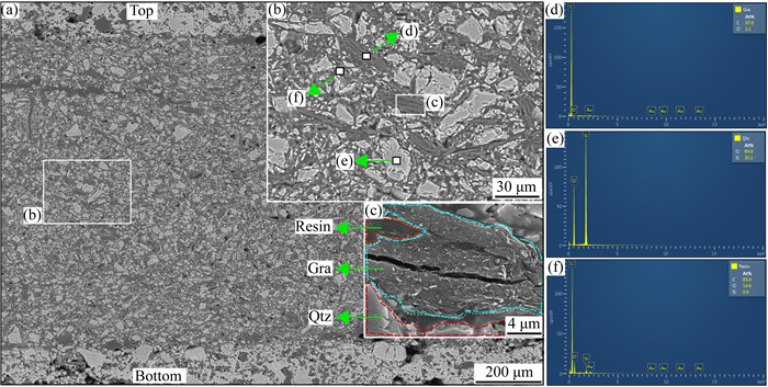 图 9 石墨含量为7 wt%的石英-石墨断层泥初始样品在4 MPa正应力下预压1h后的显微结构 (a)模拟样品的整体图像;(b)-(c)局部放大图像;(d)-(f) X射线能谱(EDS)分析结果(点位如图b所示).图中矿物缩写分别为:Gra:石墨;Qtz:石英;Resin:环氧树脂. Fig. 9 The microstructures of original quartz-graphite gouge (7 wt% graphite) statically compacted at a normal stress of 4 MPa for one hour (a) Microstructures of the entire gouge layer; (b)-(c) Close-up view of the gouge; (d)-(f) Energy dispersive spectrum (EDS) analyses of the sample (the analyzed areas are indicated by small filled rectangles in (b)). Abbreviation of minerals: Gra: graphite, Qtz: quartz, Resin: epoxy resin. |