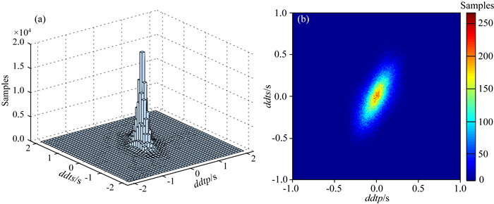1.3 误差分析与二维高斯分布波速比的计算容易受到震相读取误差的影响,因此有研究人员对波速(比)的变化持有怀疑态度(Geller, 1997),认为难以区分真实的异常变化和误差效应.观测系统误差和人为读数偏差对波速比的影响显而易见(顾瑾平和盛国英,1991;蔡静观,2000),但这些误差又是不可避免的.为了最大可能消除误差的影响,多数研究者采用的方法是使用波形互相关来改善震相到时的准确度(Lin and Shearer, 2009; Lin, 2013; Zhang and Lin, 2014; Lin et al., 2015; Bachura and Fischer, 2016).但该方法仍然存在很大的局限性,尤其是应用到震群活动时:震群活动期间,震源区介质高度破碎,细小的断层、裂纹四处发展,不是所有的小震都能找到合适的模板地震来进行相关.