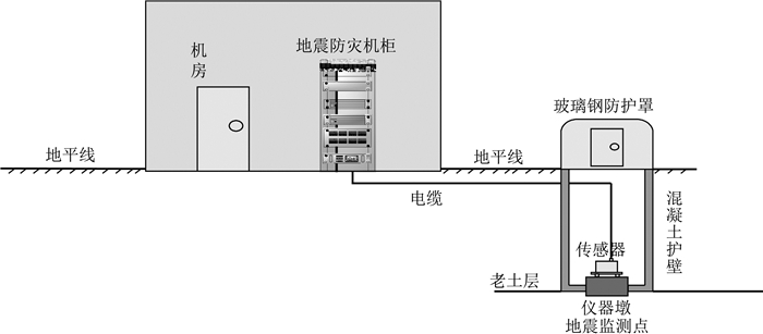 但近年来,随着我国经济的飞跃发展,中国的城镇化建设正快速推进,城镇扩张迅速,大量的建筑物随之涌现.这些建筑物建设过程中对地表地貌改变较大,对局部覆盖原状土层产生扰动,至使符合我国强震动观测台站建设要求的自由场地锐减,迫使有些强震动观测台站建设在非原状土场地上,如直接将强震动观测仪安放在局部回填土场地上或回填土场地深挖基坑内.在已建成和投入运行的京沪、哈大、京石武等高速铁路地震预警系统中,考虑到地震信息检测需尽量离高铁线路较近的要求,往往难以选择到满足自由场地强震动观测的合适场地,预警强震动台站仪器只能布设在回填土场地上或回填土场地深挖基坑内以实现对地震信息的检测.这导致相应的台站建设场地并非强震动台站建设所要求的自由场场地,如图 1所示.已有的研究表明(杨柏坡和杨笑梅,1997),如此处理对场地震动的观测会产生一定的影响.