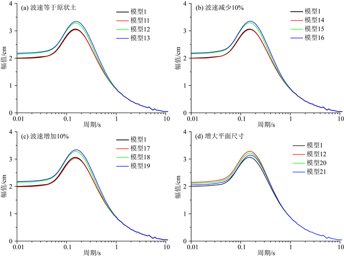 图 12d为重塑土剪切波速等于原状土且重塑土区域平面尺寸不同时场地反应谱曲线.图示结果表明,随着重塑土区域平面尺寸(模型12为2 m×2 m、模型20为4 m×4 m、模型21为6 m×6 m)的增加,场地地表反应谱与自由场(模型1)反应谱的差异越来越小,且影响周期越来越小.