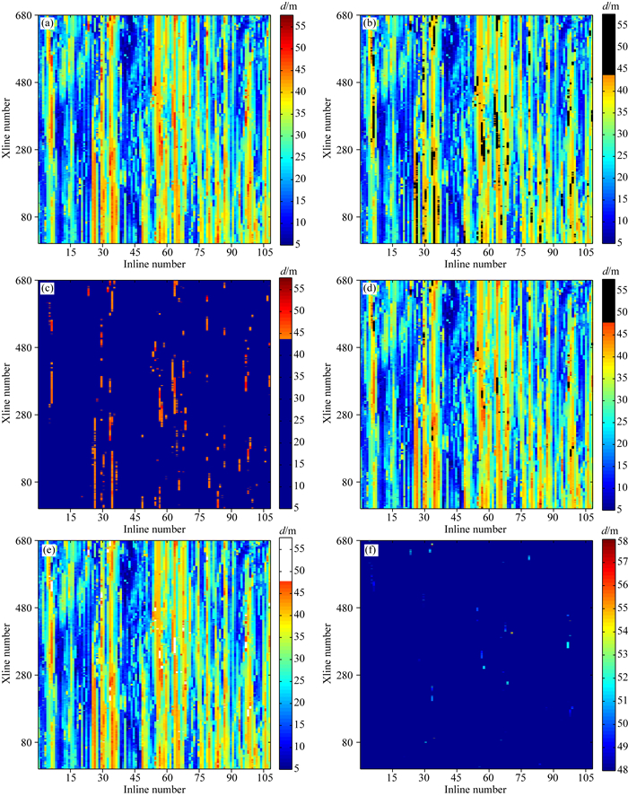 对比之下,如果我们不对X节点以上的单道重复性做收缩处理,就会出现重复性数值自X节点增长变大并或有超过外推点的观测系统重复性值,使原失配产生的X节点与外推点之间的反映失配的观测系统重复性值及其所处位置被淹没在其中. 图 8a显示了这种情况. 图 8b和图 8c为分别用纯黑和纯白颜色标记了外推点外的重复性数值区域的显示结果,而在图 8d中显示了过滤筛选出的这些数据. 图 8e和f分别显示了过滤出的X节点外面元多道观测系统重复性值及其分布和X节点与外推点之间的面元多道观测系统重复性值及其分布.