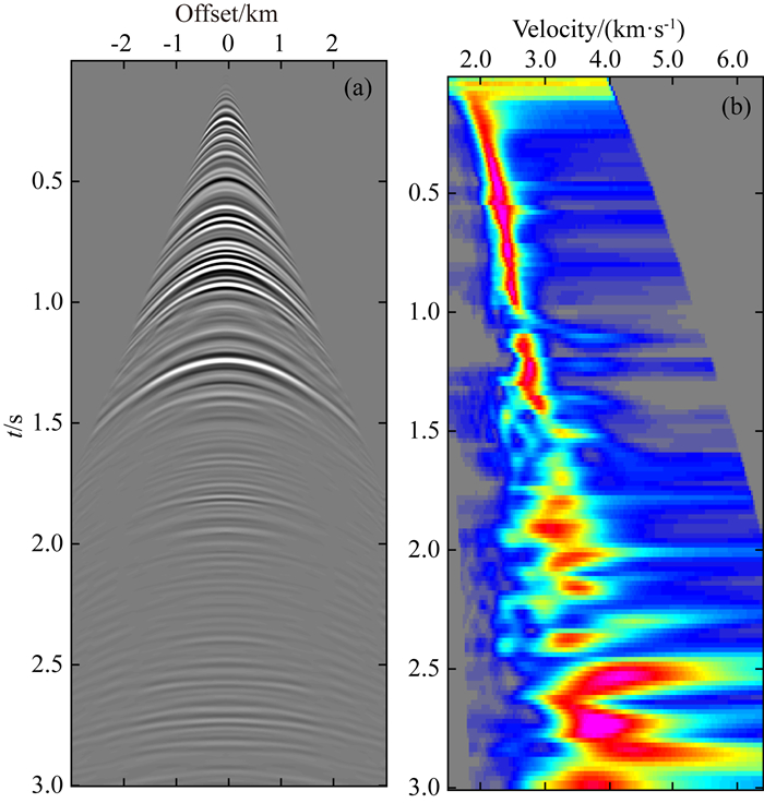 图 16 层间多次波消除之后的CMP道集(a)及其对应的速度谱(b) Fig. 16 CMP gather (a) and its velocity spectrum (b) after internal multiple elimination |